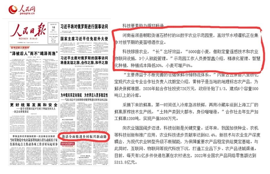 近日,物理所子公司河南省現(xiàn)代農(nóng)業(yè)大數(shù)據(jù)產(chǎn)業(yè)技術(shù)研究院有限公司5G數(shù)字農(nóng)業(yè)示范園被人民日報頭版、人民網(wǎng)、河南日報等媒體相繼報道。