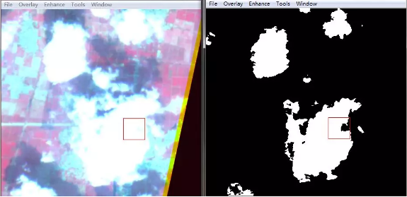 從圖1的“珠海一號(hào)”高光譜遙感衛(wèi)星影像中可以看到,研究區(qū)域的東南區(qū)域存在部分云量,在分類之前需要先將云掩膜去除。云的光譜特征曲線如圖2所示,云的反射率在480nm~866nm之間具有較高的值,而在紅光范圍內(nèi)640nm附近處于相對(duì)較低的反射率。根據(jù)這一特點(diǎn),將云提取出來(lái)。結(jié)果如圖3所示。