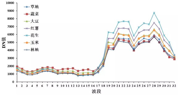我們將實(shí)地提取的農(nóng)作物進(jìn)行分析得出平均光譜,如下圖所示,將農(nóng)作物分為玉米、紅薯、大豆、花生、蔬菜、草地、林地、其他植被和非植被(水體、建筑、裸地和道路)。