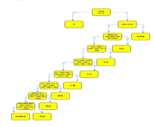 (2)根據(jù)圖(4)各地物光譜以及NDVI特征構(gòu)建分類決策樹進(jìn)行農(nóng)作物分類,決策樹如下圖(5)所示: