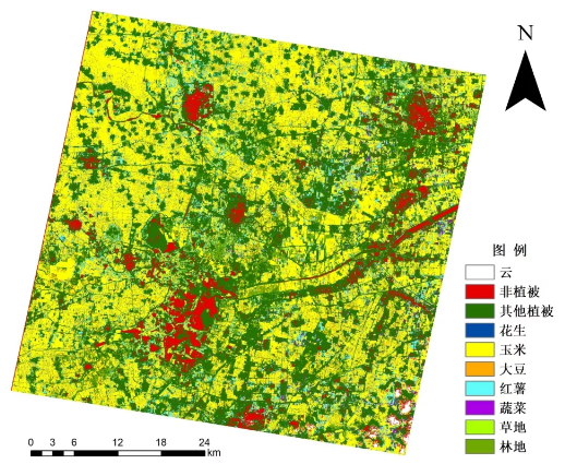 實(shí)驗(yàn)利用“珠海一號(hào)”高光譜遙感衛(wèi)星影像數(shù)據(jù),結(jié)合實(shí)地調(diào)查樣點(diǎn),基于決策樹分類方法,對(duì)研究區(qū)土地覆蓋類型進(jìn)行分類,利用驗(yàn)證樣點(diǎn)基于混淆矩陣并利用實(shí)測(cè)點(diǎn)對(duì)分類結(jié)果進(jìn)行精度驗(yàn)證Kappa系數(shù)為0.95,總體精度達(dá)95.94%,精度評(píng)價(jià)結(jié)果如下表1所示,其中花生、玉米、大豆、紅薯、蔬菜具有較高的分類精度,花生和玉米存在小部分混分,由于遙感影像不可避免會(huì)存在“同譜異物”現(xiàn)象,導(dǎo)致蔬菜和其他植被存在混分現(xiàn)象。