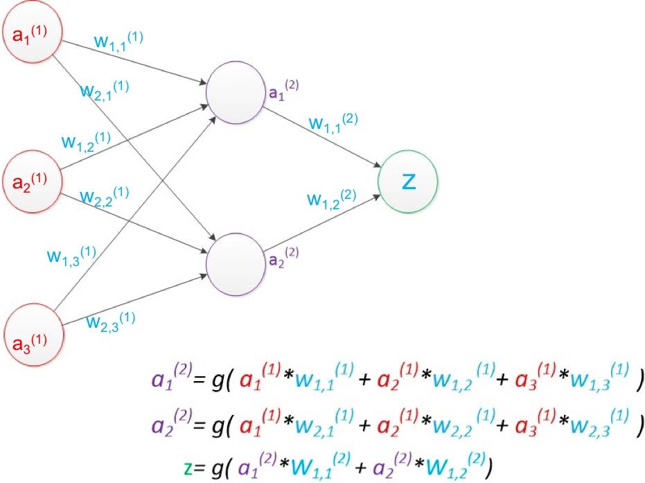 深度學(xué)習(xí)是機(jī)器學(xué)習(xí)中人工神經(jīng)網(wǎng)絡(luò)算法的延伸和發(fā)展,近期深度學(xué)習(xí)的研究非常火熱,就在這里介紹一下神經(jīng)網(wǎng)絡(luò)和深度學(xué)習(xí)。先說(shuō)兩層網(wǎng)絡(luò),如下圖,其中a是“單元”的值,w表示“連線(xiàn)”權(quán)重,g是激活函數(shù),一般為方便求導(dǎo)采用sigmoid函數(shù)。采用矩陣運(yùn)算來(lái)簡(jiǎn)化圖中公式:a(2) = g( a(1) * w(1) ), z = g( a(2) * w(2) )。設(shè)訓(xùn)練樣本的真實(shí)值為y,預(yù)測(cè)值為z,定義損失函數(shù) loss = (z – y)2,所有參數(shù)w優(yōu)化的目標(biāo)就是使對(duì)所有訓(xùn)練數(shù)據(jù)的損失和盡可能的小,此時(shí)這個(gè)問(wèn)題就被轉(zhuǎn)化為一個(gè)優(yōu)化問(wèn)題,常用梯度下降算法求解。一般使用反向傳播算法,從后往前逐層計(jì)算梯度,并最終求解各參數(shù)矩陣。